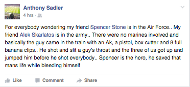 American forces have again proven themselves in Europe, this time on holiday. Several Americans from the Air Force, the Army, and a private citizen have prevented what could have easily been a travesty, in a random act of vigilant counter-terrorism.  The three heroes are Anthony Sadler, a private citizen, Alex Skarlatos, of the Oregon Army National Guard, and Spencer Stone, of the USAF who sustained injuries while detaining the attacker.