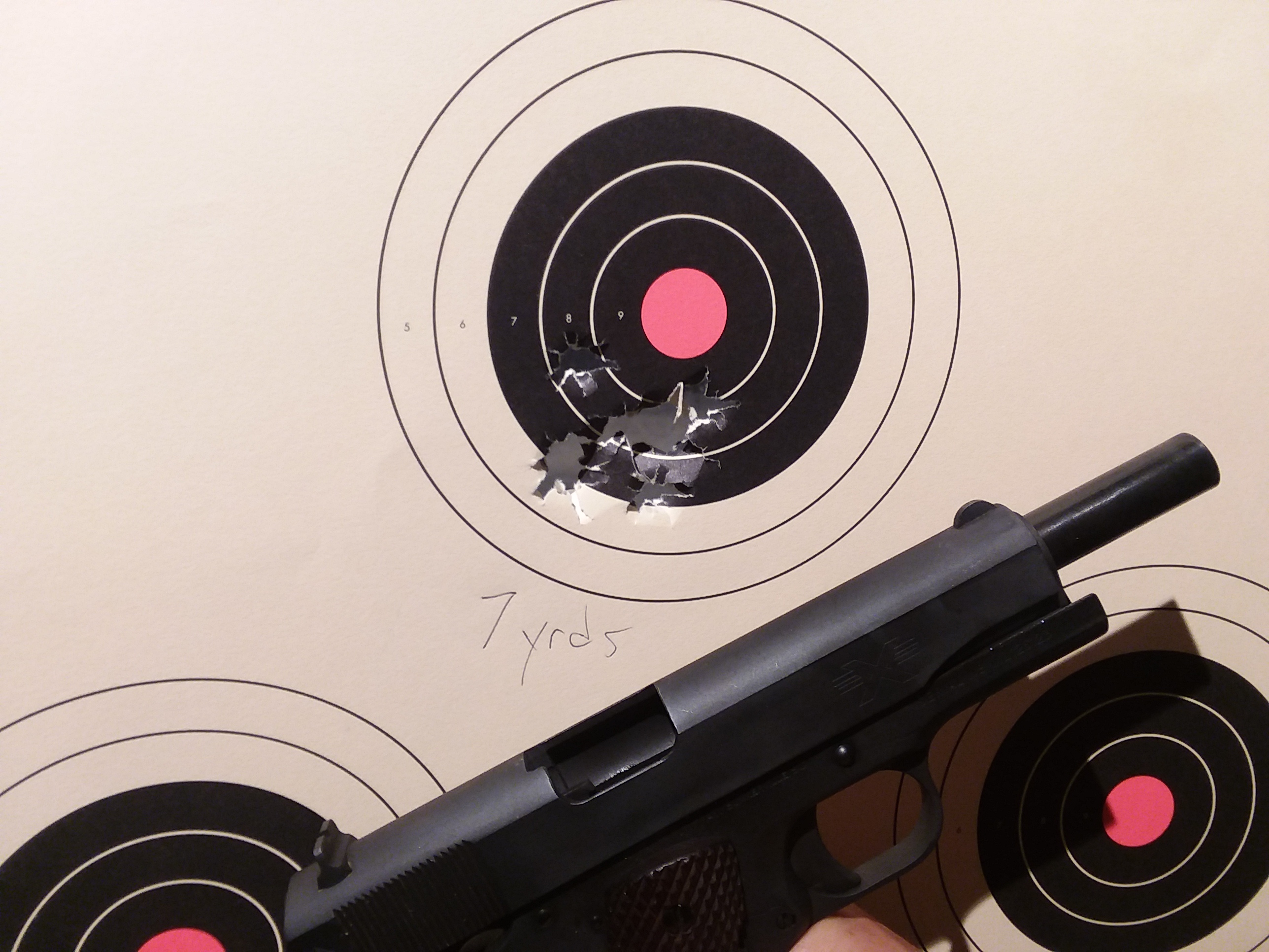 All that being said, the gun retails for around $380 and holy crap does it perform! The pistol had several aspects that initially jumped out at me that I felt were worth mentioning. The trigger has one of the cleanest breaks I’ve ever felt on a 1911 and the reset is definitely something to write home about. The hammer, while classical in nature was incredibly tactile and easy to operate with one hand, this is probably attributed to its large surface area compared to the skeletonized enhanced hammer that is often found on more modern 1911 variants. Unfortunately this requires the old school beavertail safety to be used and while it is low profile, it does not allow as high a purchase on the gun as I would like. Next the action was incredibly smooth, upon racking the slide back I was greeted with solid yet buttery sensation; far from the gritty texture I was expecting. Attention to detail was apparent in the smallest ways, the guide rod spring was one I couldn’t let pass me by; it’s beefy and not chopped off on one end like some more expensive brands have become accustomed to doing. The ACT magazine is drop free and feeds reliably, but past experience has made me wary of the brand (a cracked lip on the top right of a previously owned mag). This gun is by no means a race horse but a hammer designed for work, it almost begs to have the file taken to a few choice locations just to recreate the rattle/reliability of an old WWII standard issue pistol.