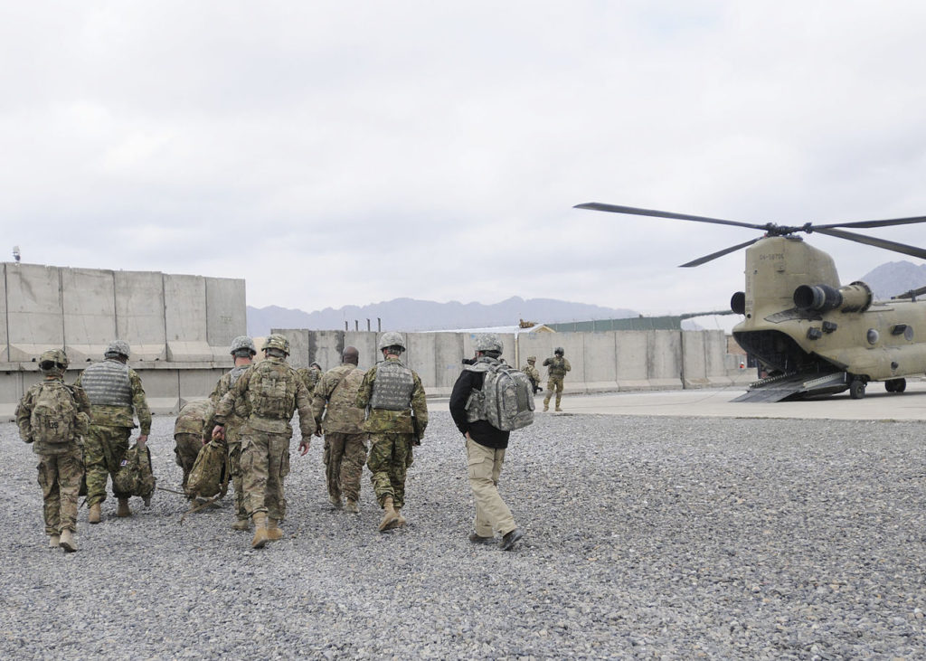 Wounded veterans, participating in Operation Proper Exit, walk toward a U.S. Army CH-47 Chinook helicopter as they prepare to leave Camp Nathan Smith in Kandahar province, Afghanistan, (Source. Wikimedia Commons)