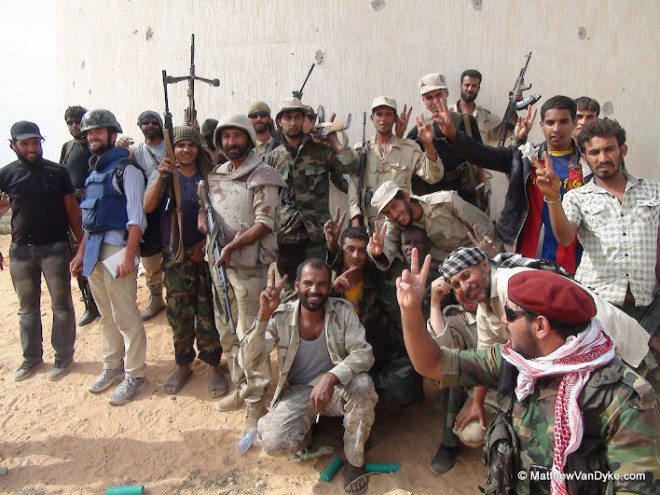 Matt believed in the cause as much as he believed in not standing aside while his friends and their families were killed off one by one. He started making phone calls to let his mother and his girlfriend know that he would soon be departing to Libya. With a Master’s Degree in Security Studies with a concentration in the Middle East from Georgetown, but zero military experience, Matt hit the ground running in Libya where he linked up with his old friends. His first day as a freedom fighter began with him working on repairing the gun truck that he and his Libyan buddies would use in the war.
