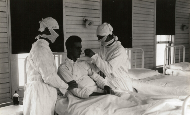 Treating an influenza patient at a Naval hospital in New Orleans at the height of the Spanish Flu pandemic in 1918. (Wikimedia Commons)