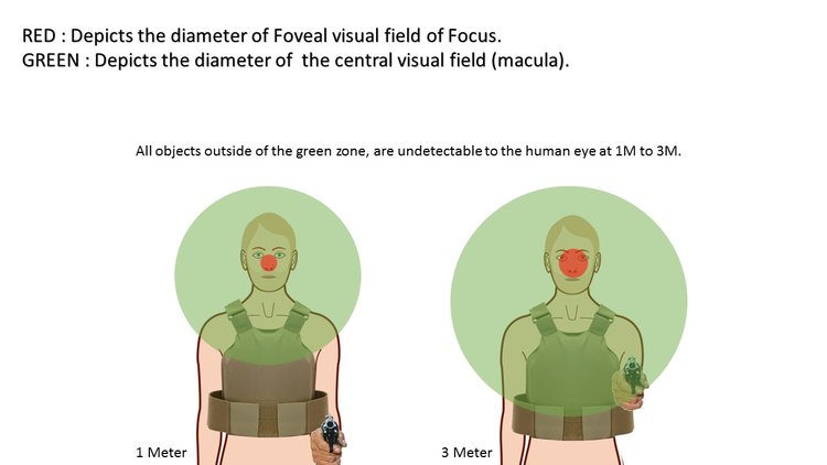 Focused vision (aka Foveal field of vision) is only 1.5 inches in diameter at six feet and 2.5 inches at 10 feet. The central visual field is 12.7 inches in diameter at six feet and 21.1 inches at 10 feet. The peripheral visual field has no ability to detect precision focus. In other words, anything the green circle below covers has no sharp detail/precision sight coverage.
