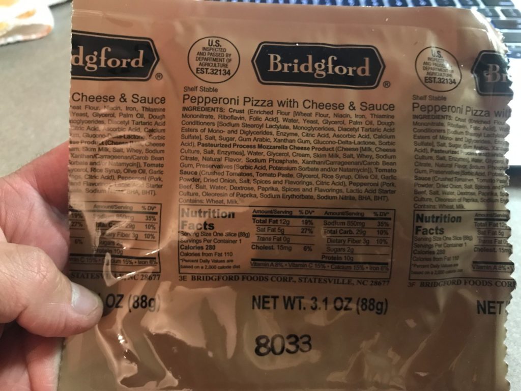 What’s an MRE for if it’s not going to load up our troops with high levels of necessary vitamins and minerals? Just like the bars of chocolate modified by Hershey’s to help soldiers in WWII. Here’s what our one serving of pizza-in-a-pouch (88 grams) could offer in terms of nutritional value: