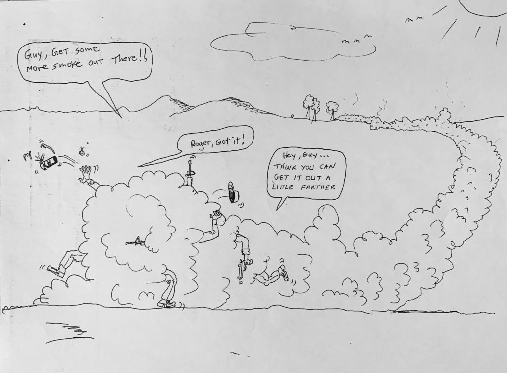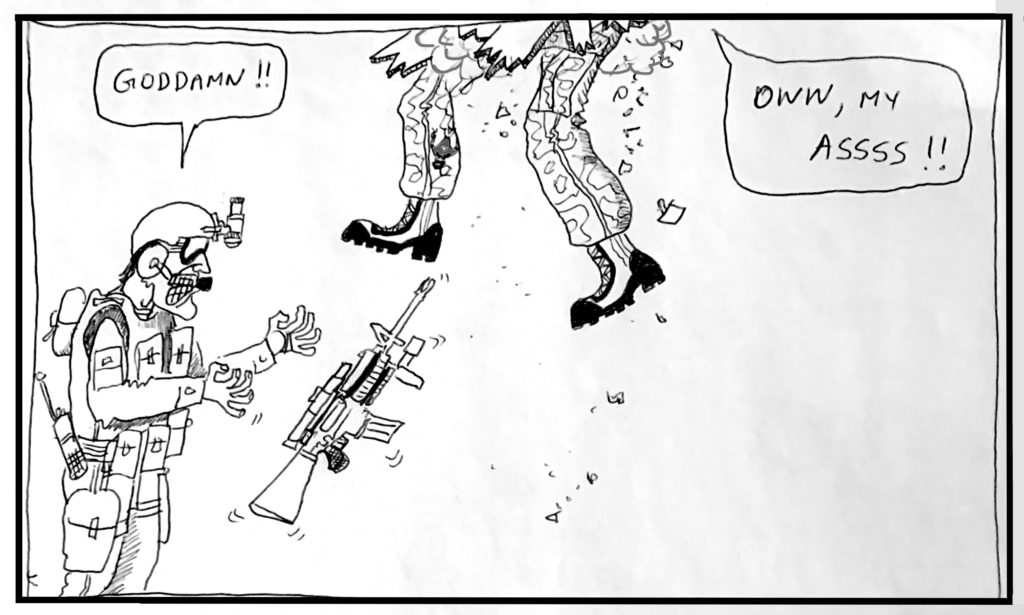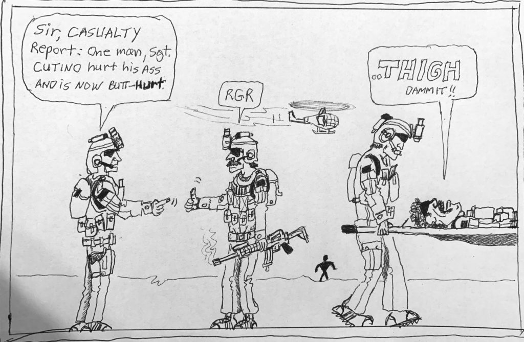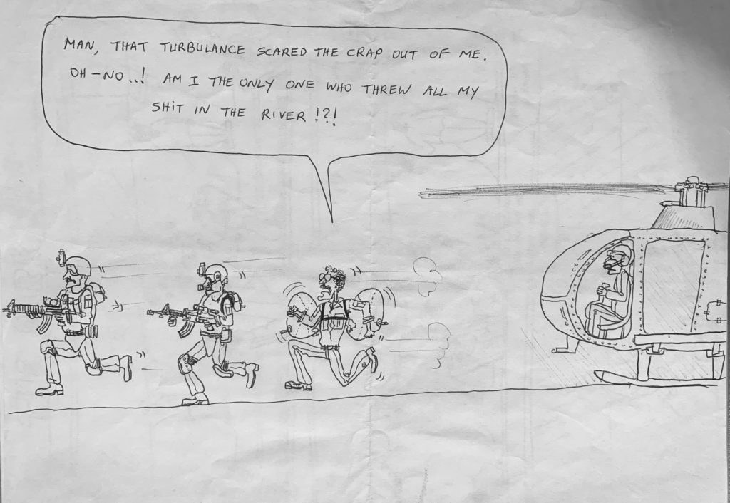 After that night, Guido and I contemplated why the helo had made the sudden drop toward the water and cringed at the thought that we might have actually succeeded in jettisoning our assault equipment into the river, only to recover and land on target wearing just our flight suits. That sparked the idea for the frame below, which got the good-natured Guido in stitches.