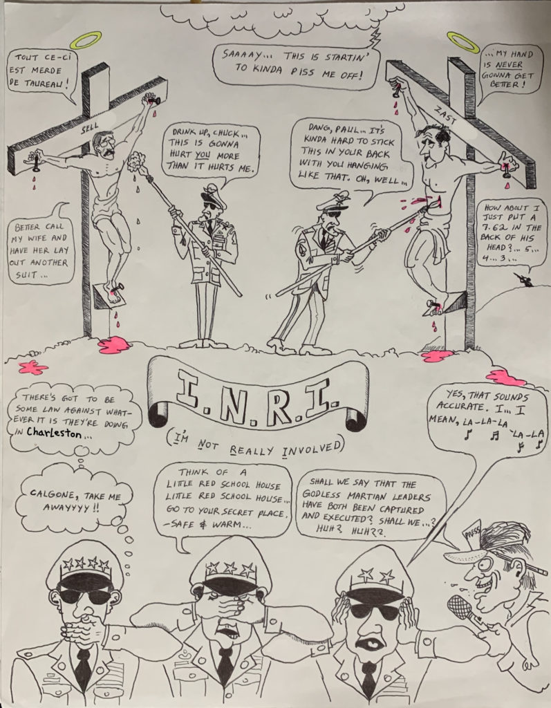 I set out to scorn the brass for disrespecting our squadron brother. I completed the cartoon and posted it. Chuck chuckled at it for a good while and then asked me to kindly remove it from the book, at least temporarily, because we didn’t want to lose control of it and have it end up in JSOC. I complied.