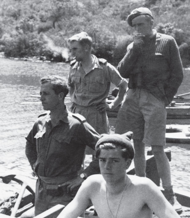 A brooding Anders Lassen (sweater and binoculars) with his Special Boat Service crew in Turkey. (Variety)