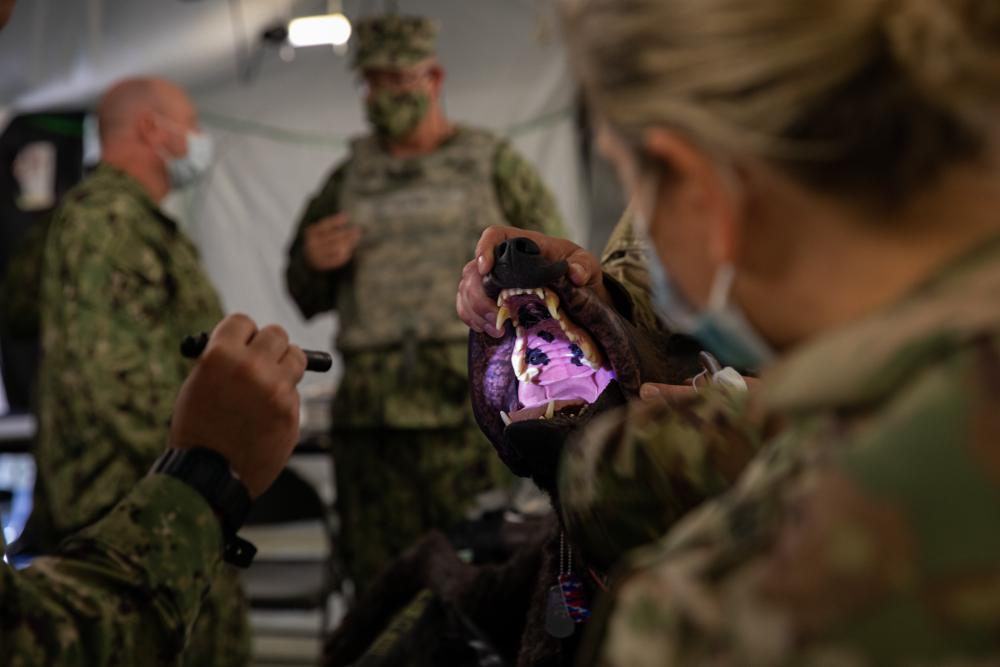 If a dog is hurt in the field, chances are high that it will be cared for by the same doctors, nurses, and combat medics who take care of human warfighters. Because of that, medical personnel must receive some training in veterinary medicine. That’s what Captain Schrader is doing in the photo above. In this specific case, she is training US Navy medical personnel to identify and clear an airway obstruction.