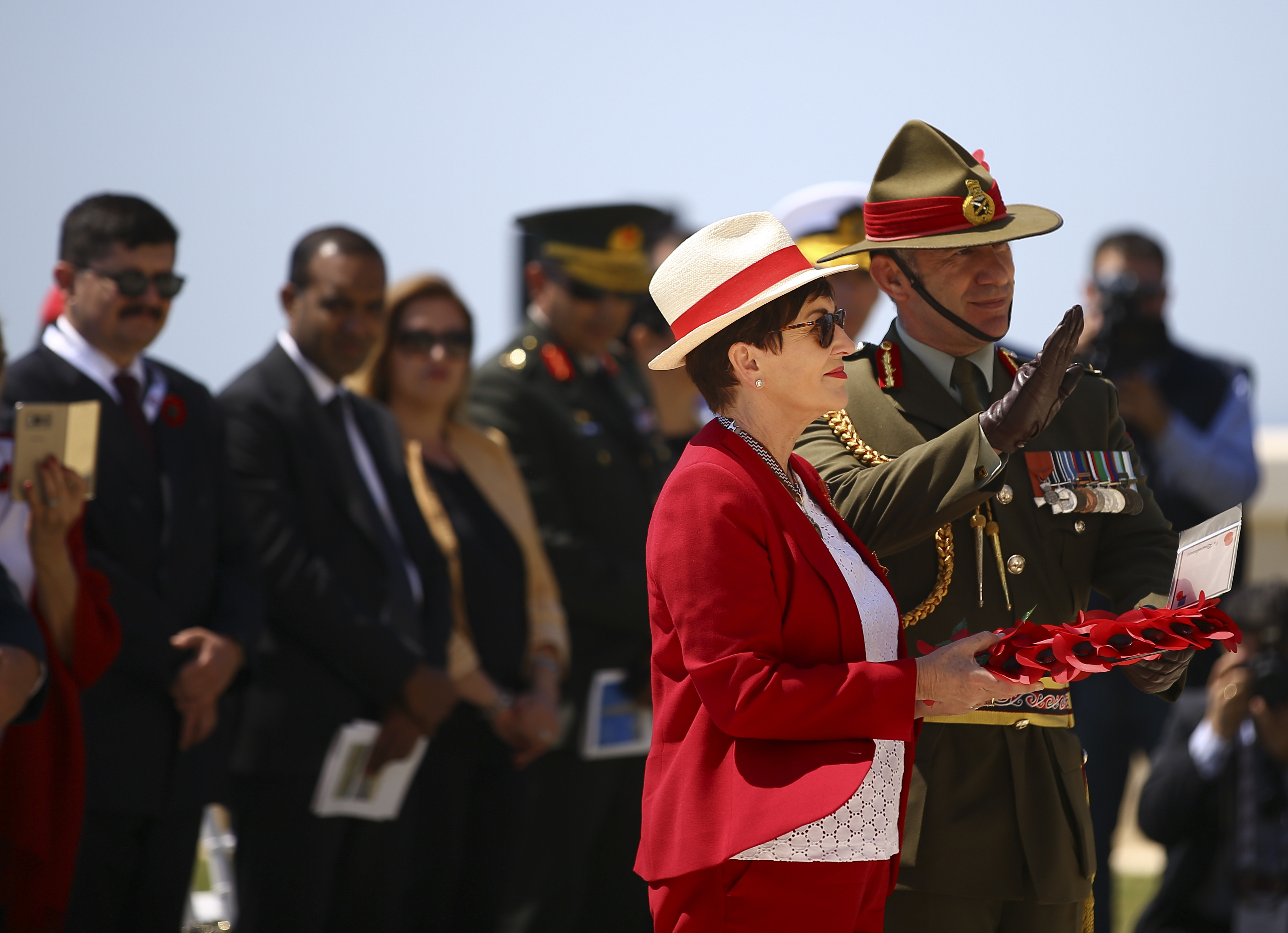 Patsy Reddy, Governor-General of New Zealand, practices the wreath-laying ceremony, ahead of the April 25 commemoration at the Helles Memorial, in the Gallipoli peninsula, near Canakkale, Turkey, Tuesday, April 24, 2018. The Helles Memorial, built in 1924 and bearing more than 21,000 names serves the dual function of Commonwealth battle memorial for the whole Gallipoli campaign and place of commemoration for many of those British and Commonwealth servicemen who died there and have no known grave. The annual Anzac Day ceremony on April 25 remembers the forces of the Australian and New Zealand Army Corps under British command in World War I who fought a bloody nine-month battle against Turkish forces in 1915. (AP Photo/Emrah Gurel)