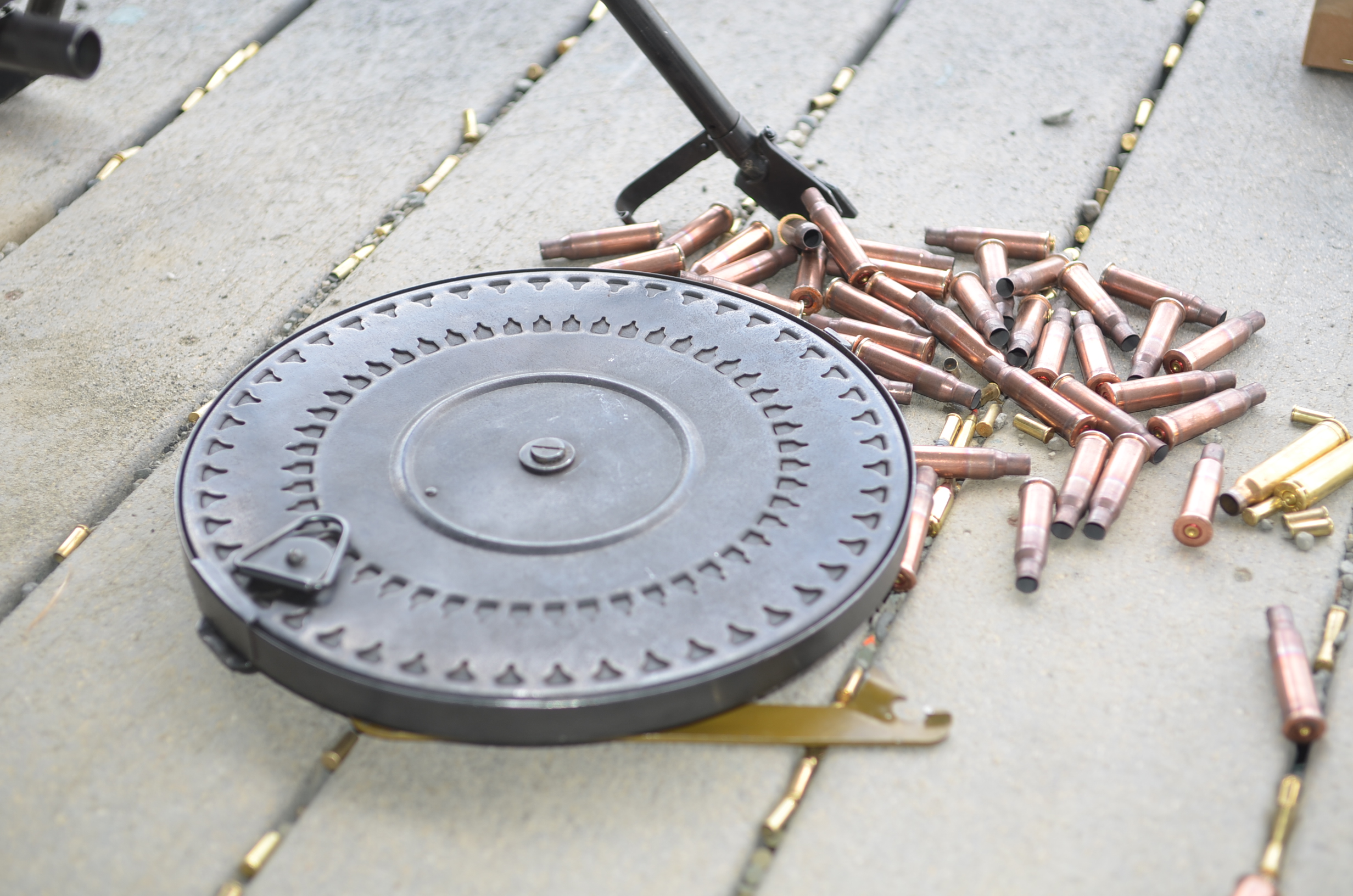 After defeating the steel Soviet tuna can shaped ammunition container, with the help of a can opener, I began to load the 47 round drum. I quickly found out that it’s an awkward pain in the ass procedure. The magazine pan has a ring on the outside to rotate one half of the magazine while you feed rounds into it from the other side. It all sounds easy until you are trying to hold the steel pizza pan against your torso, turning the coil spring via the ring, and simultaneously loading rounds into the opposite side of the drum. Luckily, James is well versed in this procedure and we got everything squared away in short order.