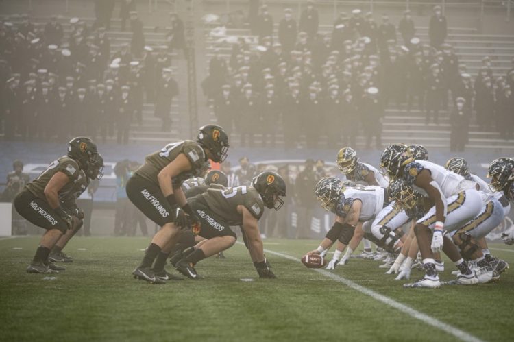 Army and Navy square off on the line of scrimmage. Army-Navy game at West Point in 2020. DVIDS photo