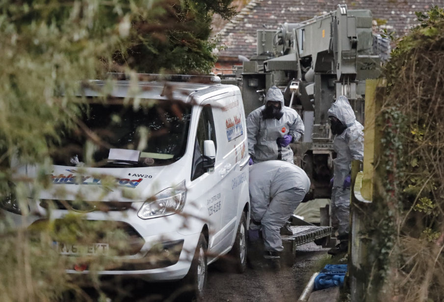 Military forces work on a van in Winterslow, England, Monday, March 12, 2018, as investigations continue into the nerve-agent poisoning of Russian ex-spy Sergei Skripal and his daughter Yulia, in Salisbury, England, on Sunday March 4,2018. | AP Photo/Frank Augstein