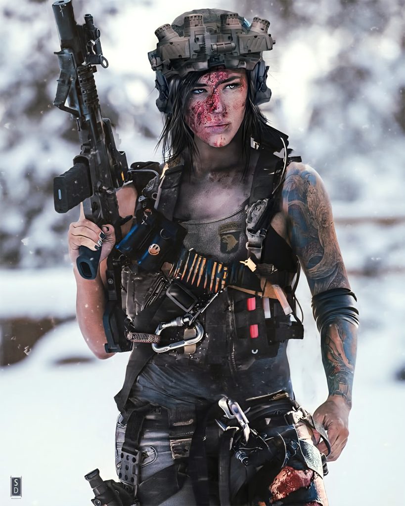 This is tactical glam. Military pin-up 2.0. Call it operator poster art. The goal is presence. Lethal confidence. Sexy in a way that says, “Don’t confuse me with fragile.”