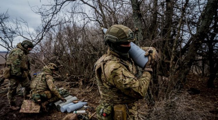 A 152 mm shell, to be fired from a Msta-B howitzer, is being carried by a Ukrainian soldier near the embattled Ukrainian town of Bakhmut. Image from the Kyiv Post/Dimitar Dilkoff