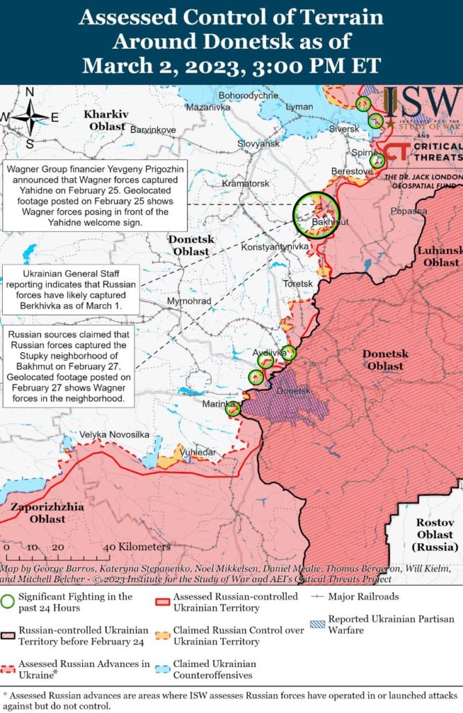 Regardless of how many casualties the Russians are taking at Bakhmut, the Ukrainians are being squeezed out rather quickly. Ukrainian forces maintain their pledge to defend what they call “fortress Bakhmut” but, as mentioned earlier, many are busy building defensive positions outside the city in hopes of preventing even more land from being taken. Today, the importance of Bakhmut, which had a population of a little over 70,000 before the war, is more symbolic than tactical. Putin has to show something for the hundreds of thousands of troops killed or wounded during his year-long “special military operation.”