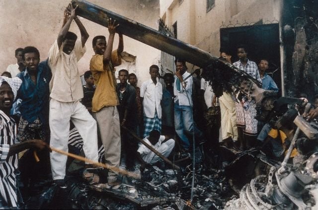Somalis celebrate at the site of the downed Black Hawk. Image courtesy of key.aero.