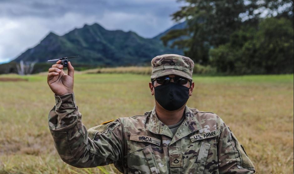 Black Hornet Spy Drone. U.S. Army Soldier PFC Madaleyva, Xavier assigned to Alpha Company “Sapper” 2nd Infantry Brigade Combat Team, 25th Infantry Division, conducts training on the Soldier Borne Sensor (SBS). The FLIR System’s Black Hornet 3 (BH3) allows soldiers to deploy the BH3 micro drone to directly ascertain situational awareness and gain and maintain contact with obstacles/danger areas where a soldier cannot physically reconnoiter. DVIDS photo