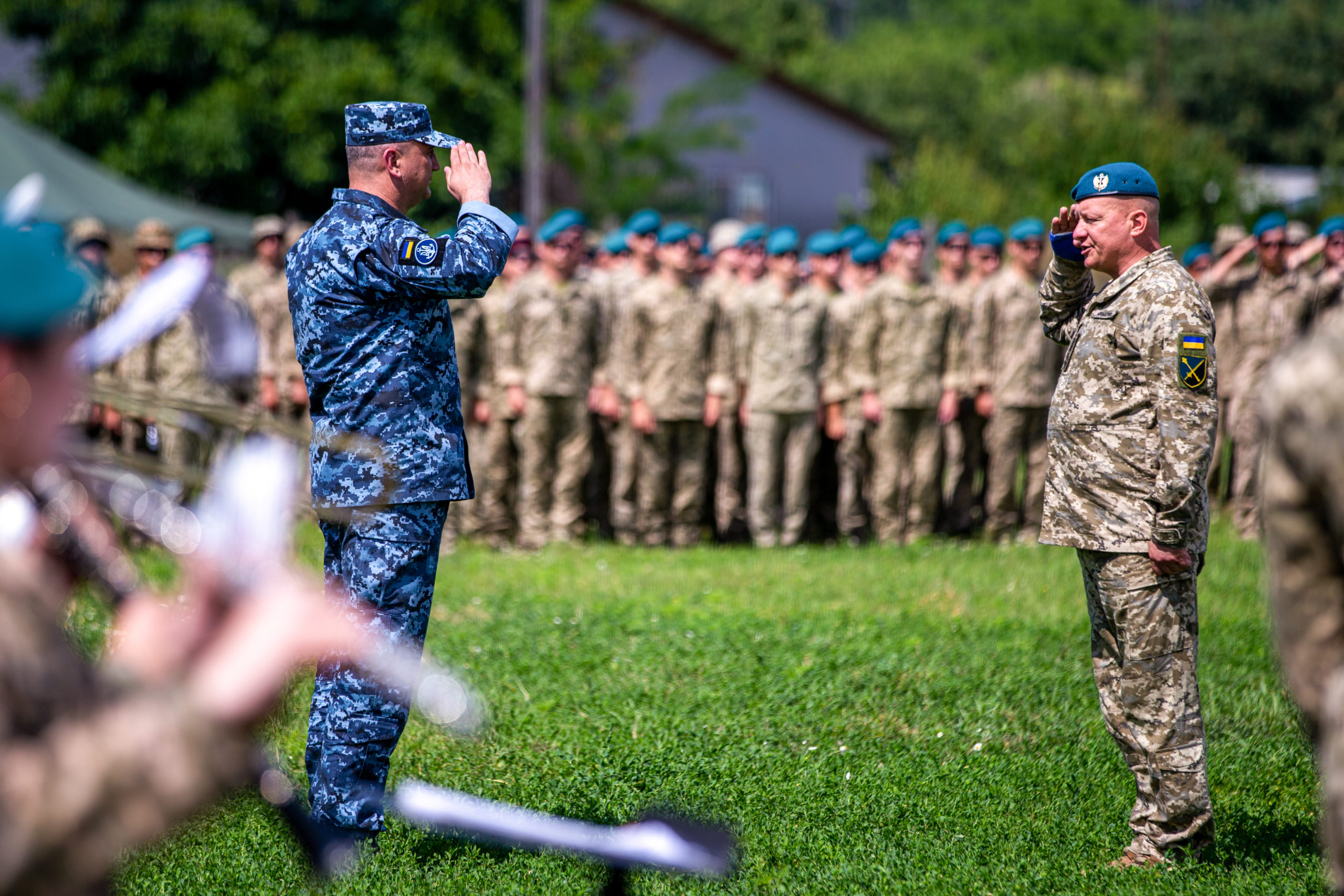 210628-M-JQ356-1013 OLESHKY SANDS, Ukraine (June 28, 2021) Lt. Gen. Yuri Sodol of Ukrainian Marine Corps, right, salutes Rear Adm. Oleksiy Neizhpapa, Commander of the Ukrainian Navy, left, during the opening ceremony of the land portion of exercise Sea Breeze, June 28, 2021, in Oleshky Sands, Ukraine. Exercise Sea Breeze is a multinational maritime exercise cohosted by U.S. Sixth Fleet and the Ukrainian Navy in the Black Sea since 1997. Sea Breeze 2021 is designed to enhance the interoperability of participating nations and strengthen maritime security and peace within the region. (Source: Commander, U.S. Naval Forces Europe-Africa/U.S. 6th Fleet, Public domain, via Wikimedia Commons)