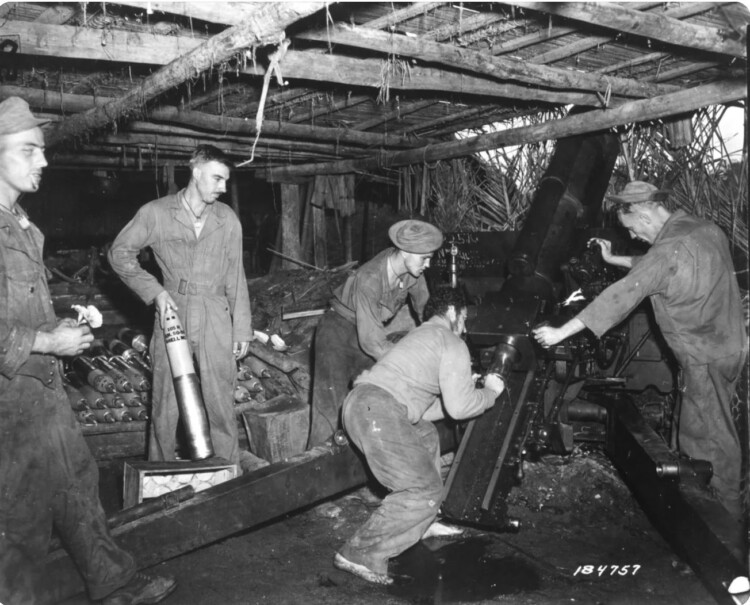 August 5th, 1943. New Guinea. Men from Battery B, 205th Field Artillery Battalion, 41st Infantry Division fire their 105mm Howitzer from a concealed position in a native hut.