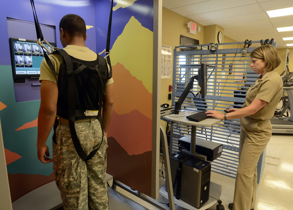 In this photo taken on June 30, 2011, Spc. Bob Westbrook, left, who has been on recent deployments to Afghanistan, has been receiving state-of-the-art treatment and rehabilitation from the Army base’s Warrior Recovery Center because of a TBI, or a Traumatic Brain Injury, in Fort Carson, Colo. Westbrook suffered a head injury when a vehicle door struck him in the head. He demonstrates the usage of Visual Spacial Concentration Activity, a part of his recovery. (AP Photo/Bryan Oller)