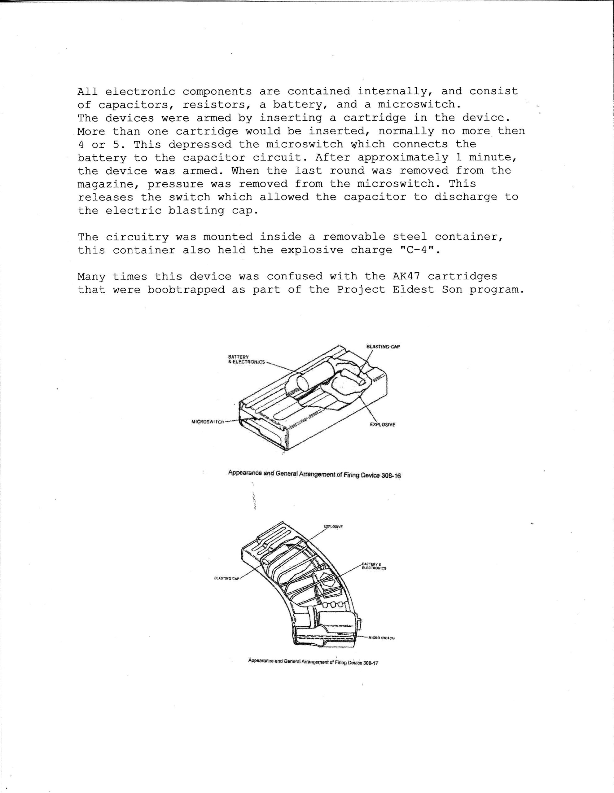 A program somewhat related to 308 Special Devices, “Eldest Son,” dealt with both sabotaged(“Salted”) ammunition that would explode when fired, and booby-trapped devices. Although Eldest Son was employed during Vietnam by the U.S. Army Military Assistance Command Studies and Observations Group (MACV-SOG), with the intention being to cause fear in the minds of enemy combatants that the items they were using might explode in their face according to exchanges I had with EOD SGM Mike R. Vining, USA (Retired), and as described in his excellent publication, History of Army EOD in Vietnam.