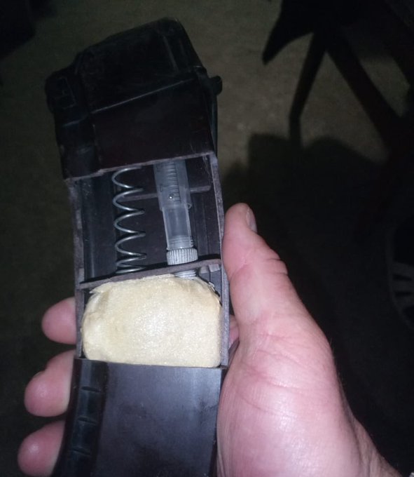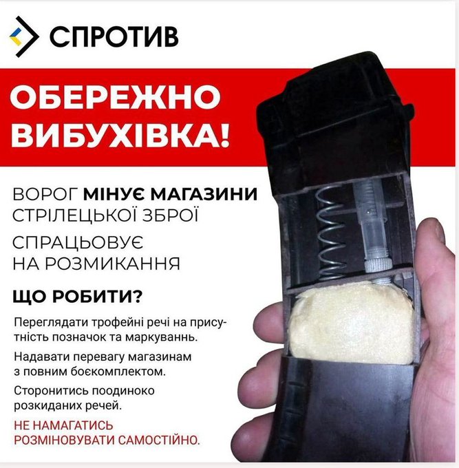 In a posting made on March 25, 2022, Twitter user @ZloyAtoshnik posted a photo of a Kalashnikov rifle magazine cutaway depicting what appears to be a spring-loaded detonator mechanism, a buff-colored putty-like material resembling a plasticized explosive, and a message roughly translated (according to Google) to read “Guys do not pick up from old corpses or on the road.” This photo has since been shared in numerous social media posts.