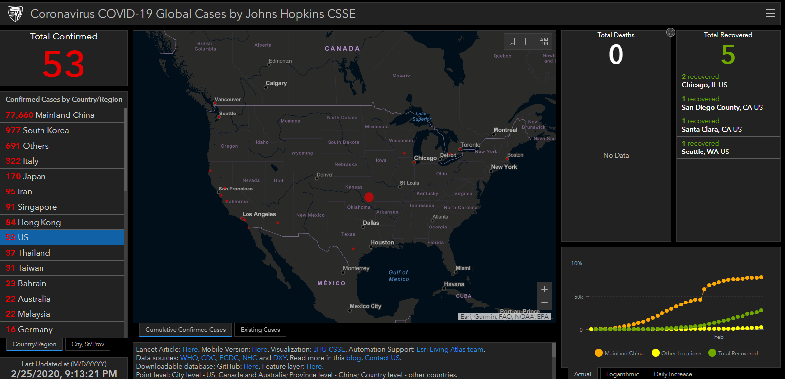 The Center for Systems Science and Engineering (CSSE) of the Johns Hopkins University has created an interactive dashboard where you can track the disease as it spreads across the world. This image portrays the spread of the virus in the U.S. as of 2/25.