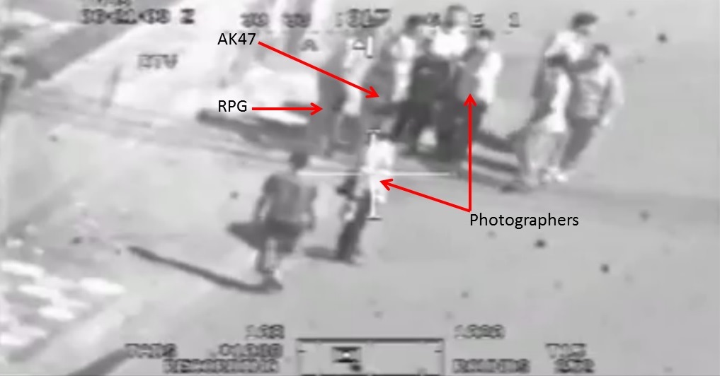 Apache helicopters didn’t engage and kill unarmed civilians and journalists in cold blood. After taking fire from insurgents, Apache helicopters were deployed. Flying 800m away, pilots using 6.25” x6.25” inch monitors correctly identify armed insurgents four seconds after mistakenly identifying long camera lenses as weapons. Unmarked photographers, casually walking among armed insurgents, cautiously peer around a corner and take pictures of U.S. vehicles that had been engaged all morning, something often done by insurgents for its propaganda value. Apaches engage until all individuals are down, and later engage an unmarked van evacuating a wounded individual, the same type of unmarked vehicles used to employ armed insurgents and evacuate wounded and weapons. After securing the area, at least three weapons and ammunition are recovered, and children found wounded in the vehicle are evacuated. Subsequently, six more insurgents, with video showing at least two of them armed, are engaged with Hellfires, likely after engaging U.S. troops that evacuated the wounded children.
