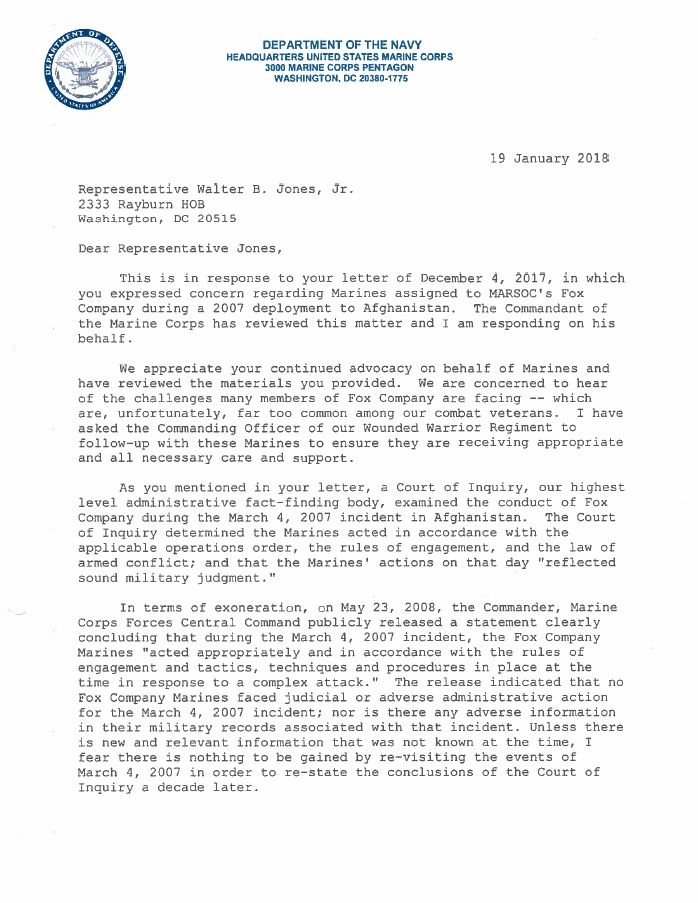 In December of 2017, Congressman Jones wrote to Marine Corps Commandant Robert Neller and asked him to take a fresh look at the case. The commandant reviewed the matter, responding in January with a letter exonerating Fox Company. The letter affirmed the finding of the 2008 Court of Inquiry and clearly states that the Marines “acted in accordance with the applicable operations order, the rules of engagement, and the law of armed conflict; and that the Marines’ actions on that day ‘reflected sound military judgement.’”