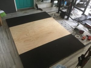 This will make a lifting platform that is 6 feet long and 8 feet wide. My lifting space is a little confined but this gets the job done. Materials are as follows (you can just as easily make an 8′ by 8′ platform here if you have the space for it, you would just need more rubber matting to account for the additional space, and obviously not need to cut the 4’x8′ pieces of wood you get from the store):