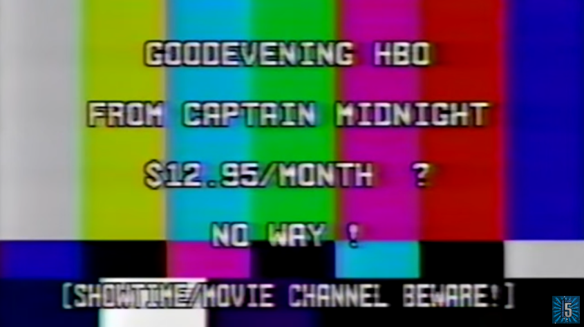 That might not always be a bad thing. Sometimes, these hijacks aren’t about the impending apocalypse, nuclear proliferation aliens, or bad 80’s TV shows. Every once in a while, a Robin Hood emerges from the digital darkness… like Captain Midnight, who interrupted an HBO broadcast in the middle of the night in 1986 to post a single cryptic message about how expensive their service was becoming: