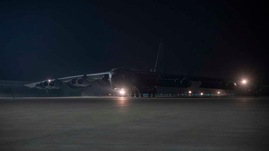 A B-52 bomber sits on an airfield in Qatar. The Pentagon has moved six B-52s to Qatar to cover the withdrawal of U.S. forces from Afghanistan. (USAF photo)