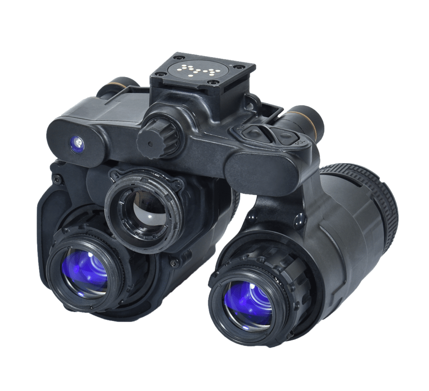 ENVG-B is primary use is as a binocular. Yet, it also offers a monocular option to provide dominant or non-dominant eye relief. A simple rotation of lens into stow position changes monocular to binocular vision. The advanced design includes a low-profile stow position against the helmet. Twin-tube design provides in-field protection from failure or damage.