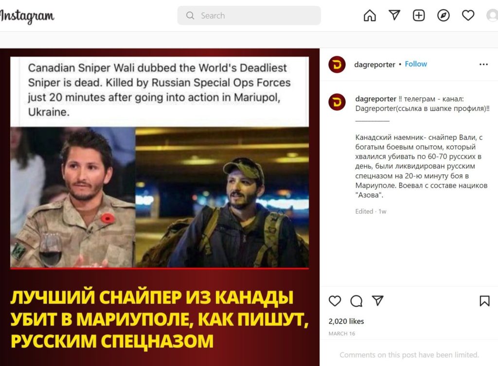 Wali says he is working alongside the Ukrainian Armed Forces, which he refers to as “awesome.” He and his Canadian partner have taken ground and made “advancements against the enemy” in the last few days. He noted that although others in his group have achieved kills, so far, he has not.