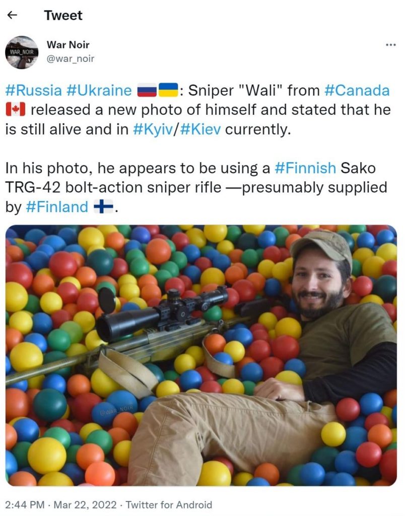 A couple of weeks ago, I wrote about how a noted Canadian sniper nicknamed Wali had left the Great White North to do some good in war-torn Ukraine.