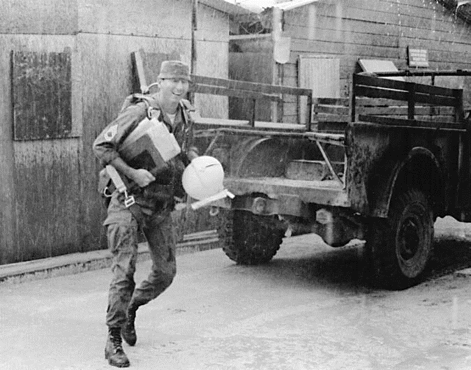 Despite the rain, Robert J. “Spider” Parks is running to a Jeep to get to Phu Bai Airport, which was south of FOB 1. Parks is running because an FOB 1 recon team is in trouble in Laos. Parks was a Covey rider for several months, where he would sit in the co-pilot seat while an Air Force pilot would fly the O-2. At FOB 1 the Covey Rider was selected because he had experience on the ground in the C&C area of operations and could better relate to the SF teams or Hatchet Force elements in the target area. Note the Covey equipment Parks is carrying, including a parachute. (Photo courtesy of Stephen Bayliss)