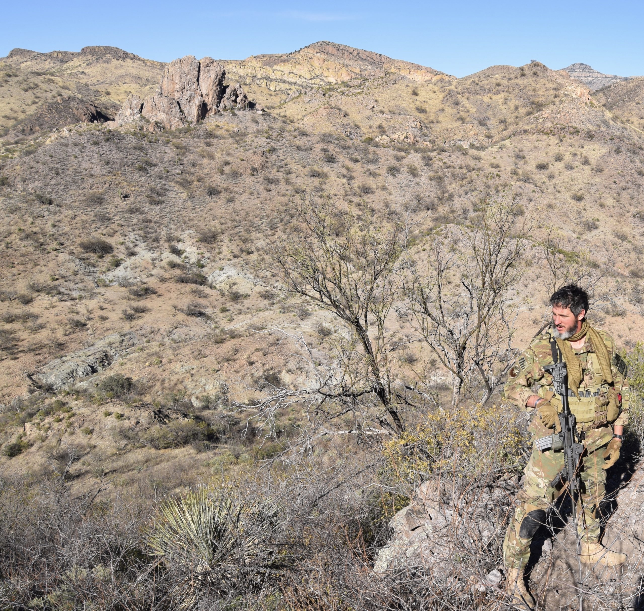 As I eat chow, I also start hydrating; once the sun makes its way over the mountains, the temperature will rise dramatically so I want to keep fluids flowing. Foley gives out the assignments while we eat. It’s going to be a busy day – I’ll be overwatching the edge of the border wall with Hugo, another long-time member of the group. We get our grid coordinates, put on kit, do a radio check with the base, and step off. The others do the same and head to their respective recce spots.