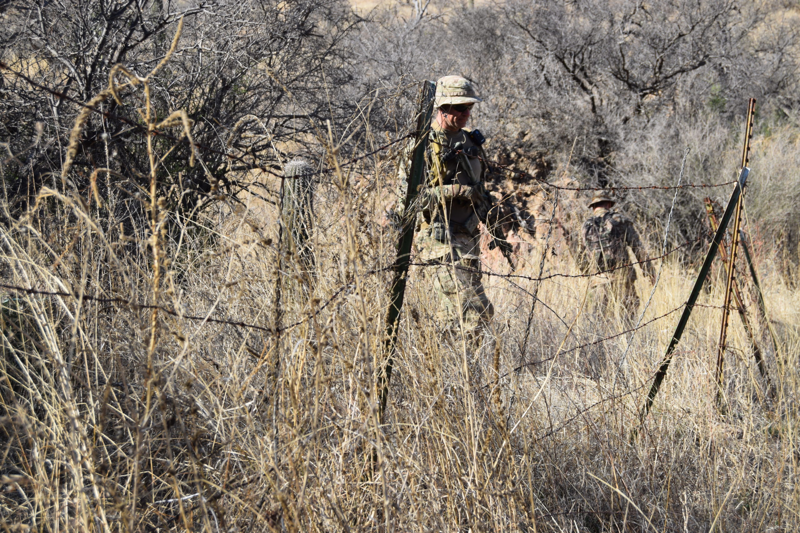 The base radio operator acknowledges our traffic, and we begin watching the area surrounding our position. I pull out my binoculars, wedging myself between rocks and some small bushes, and start scanning. Just on the south side of the border, I notice a dark spot. It’s an arrangement of large rocks stacked a few feet high; it looks intentional – not like a natural occurrence. Scanning further along the desert horizon, I notice more formations and realize these are fighting positions.