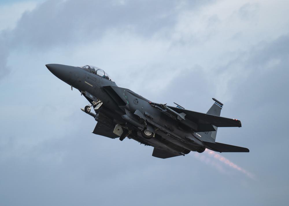An F-15E Strike Eagle assigned to the 492nd Fighter Generation Squadron takes off for the first flights of the new year at Royal Air Force Lakenheath, England