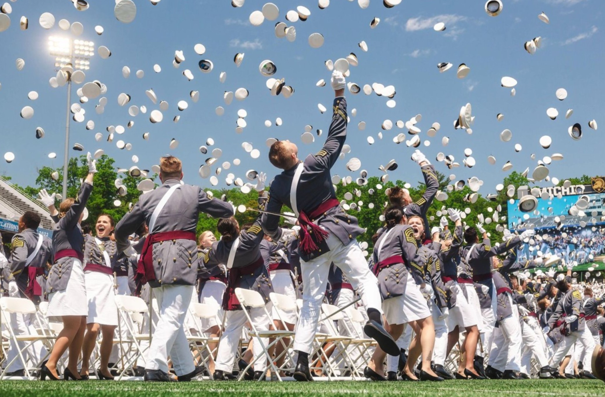 The United States Military Academy Class of 2022 toss their hats into the air.