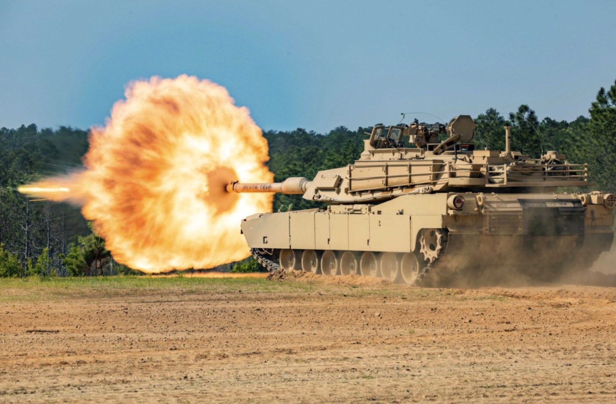 An Army M1A2 Abrams main battle tank fires at the Army Armor School at Fort Benning, Georgia.