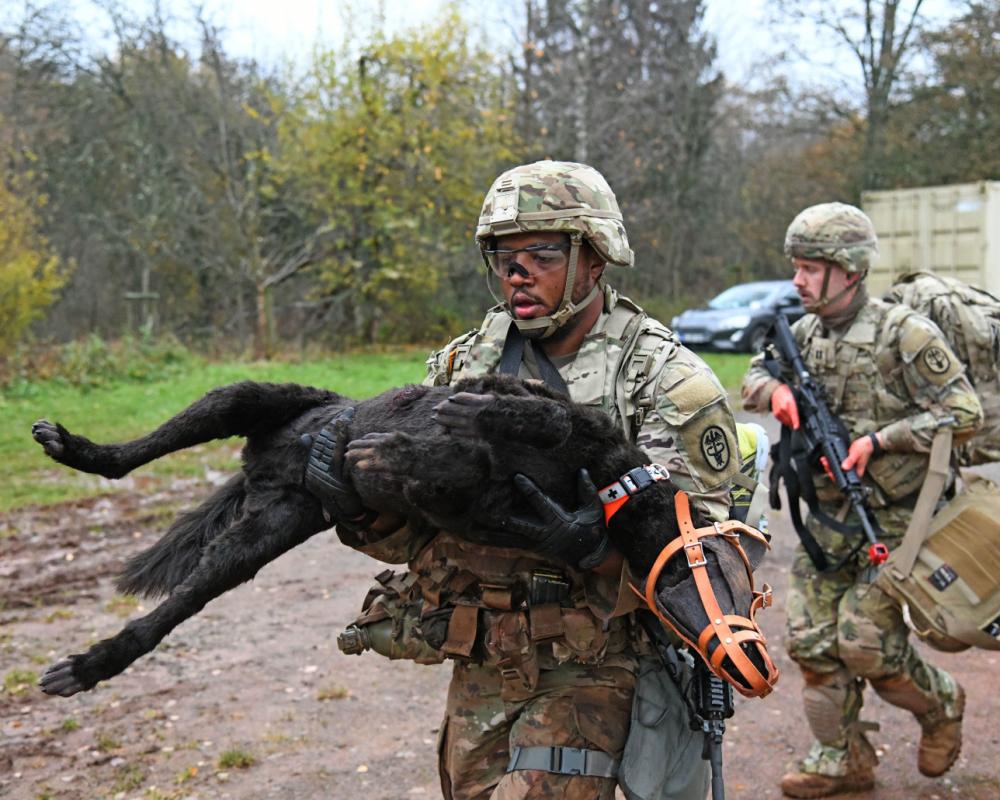 U.S. Army Sgt. 1st Class Dewey L. Ross with Dental Specialist with Dental Activity Rheinland-Pfalz complete the Mystery Event, doing Tactical Combat Casualty Care on a Working Dog Dummy during the Medical Readiness Command-Europe.