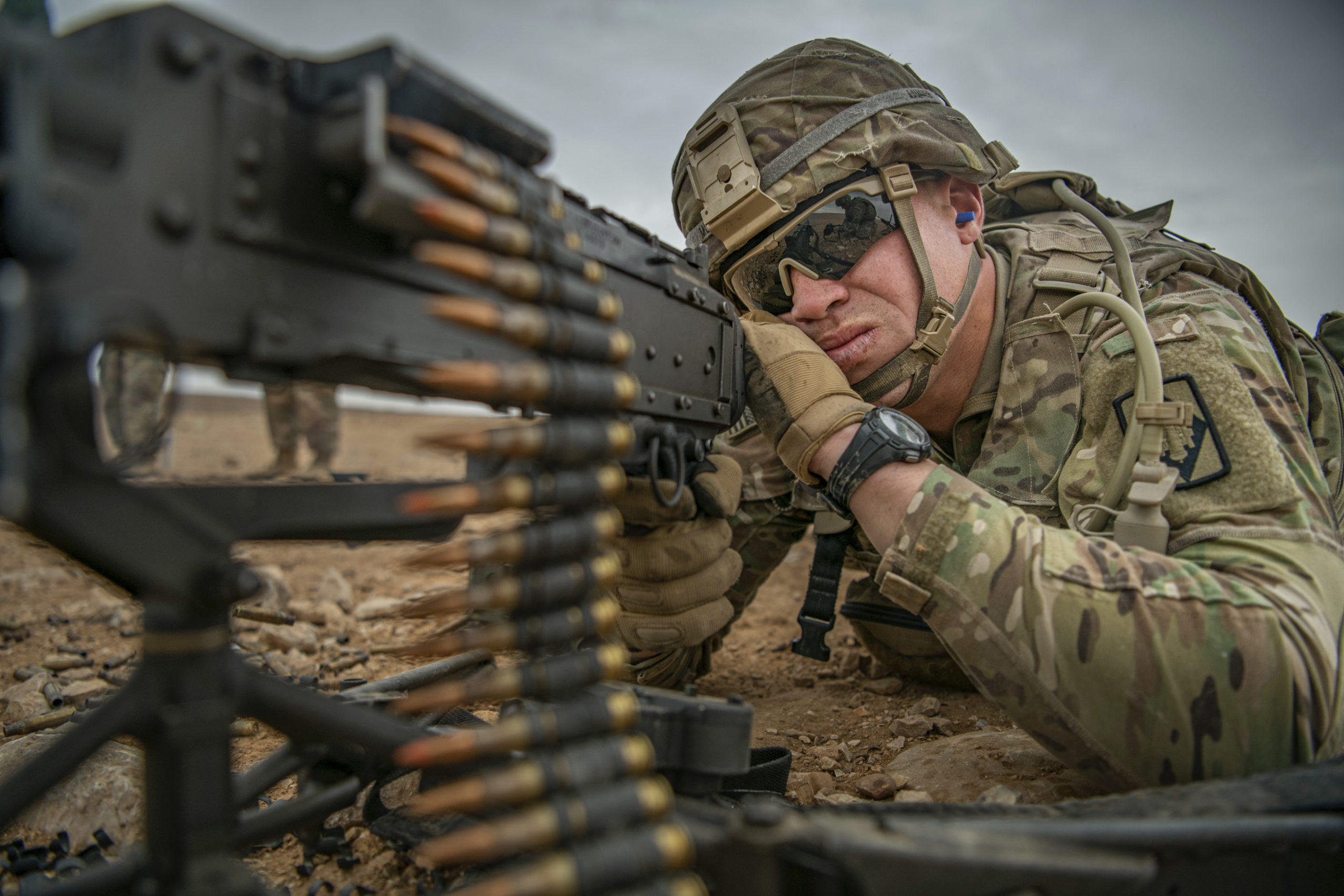 Army Staff Sgt. Dakota Montgomery fires a machine gun while deployed for Operation Inherent Resolve in the Middle East, Nov. 28, 2020.