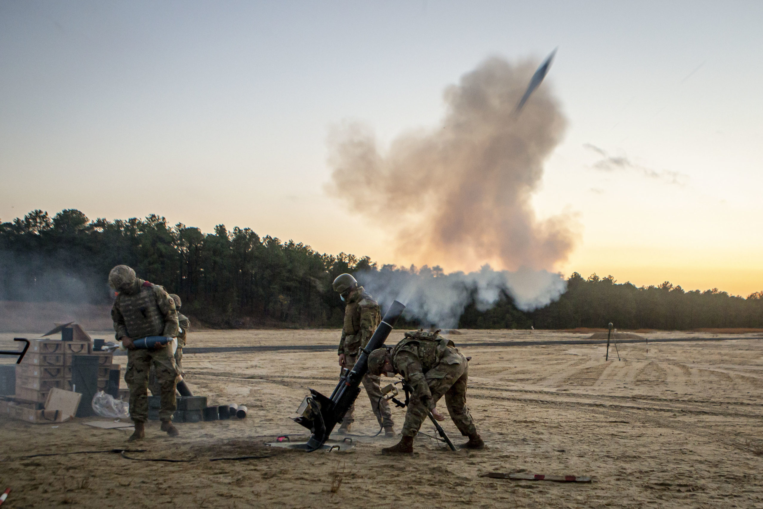 New Jersey National Guard soldiers fire a 120 mm mortar system at Joint Base McGuire-Dix-Lakehurst, N.J., Nov. 13, 2020.