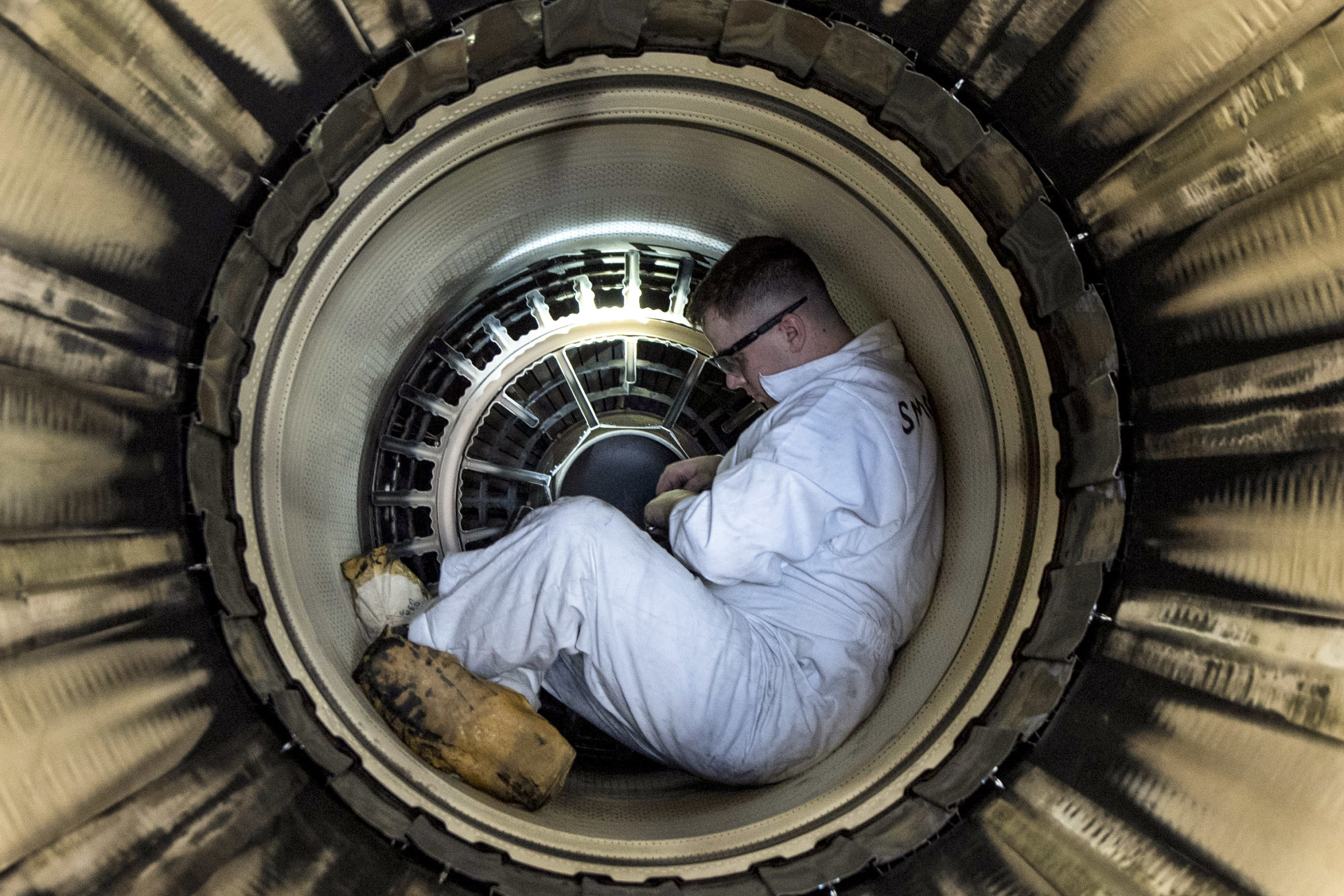 An Airman inspect the flame holder and spray rings for cracks during an augmented inspection on an F-15E Strike Eagle at Seymour Johnson AFB.