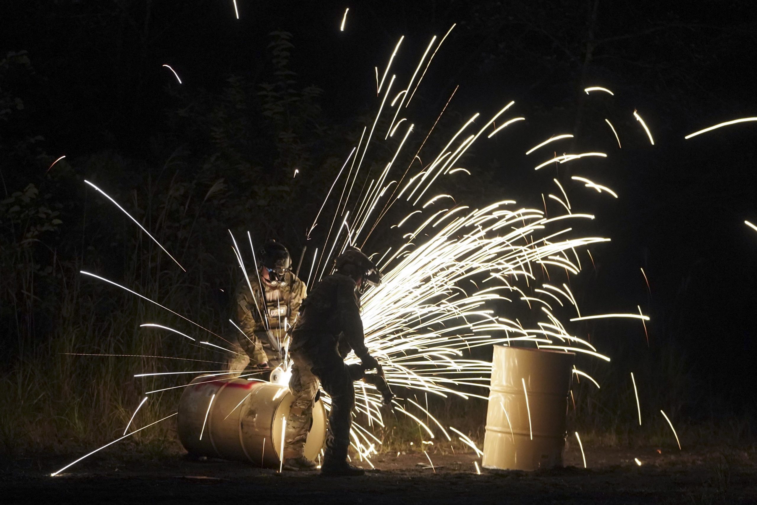 Airmen cut into barrels used as simulated light aircraft while conducting search and rescue training at Camp Fuji, Japan, Oct. 29, 2020.