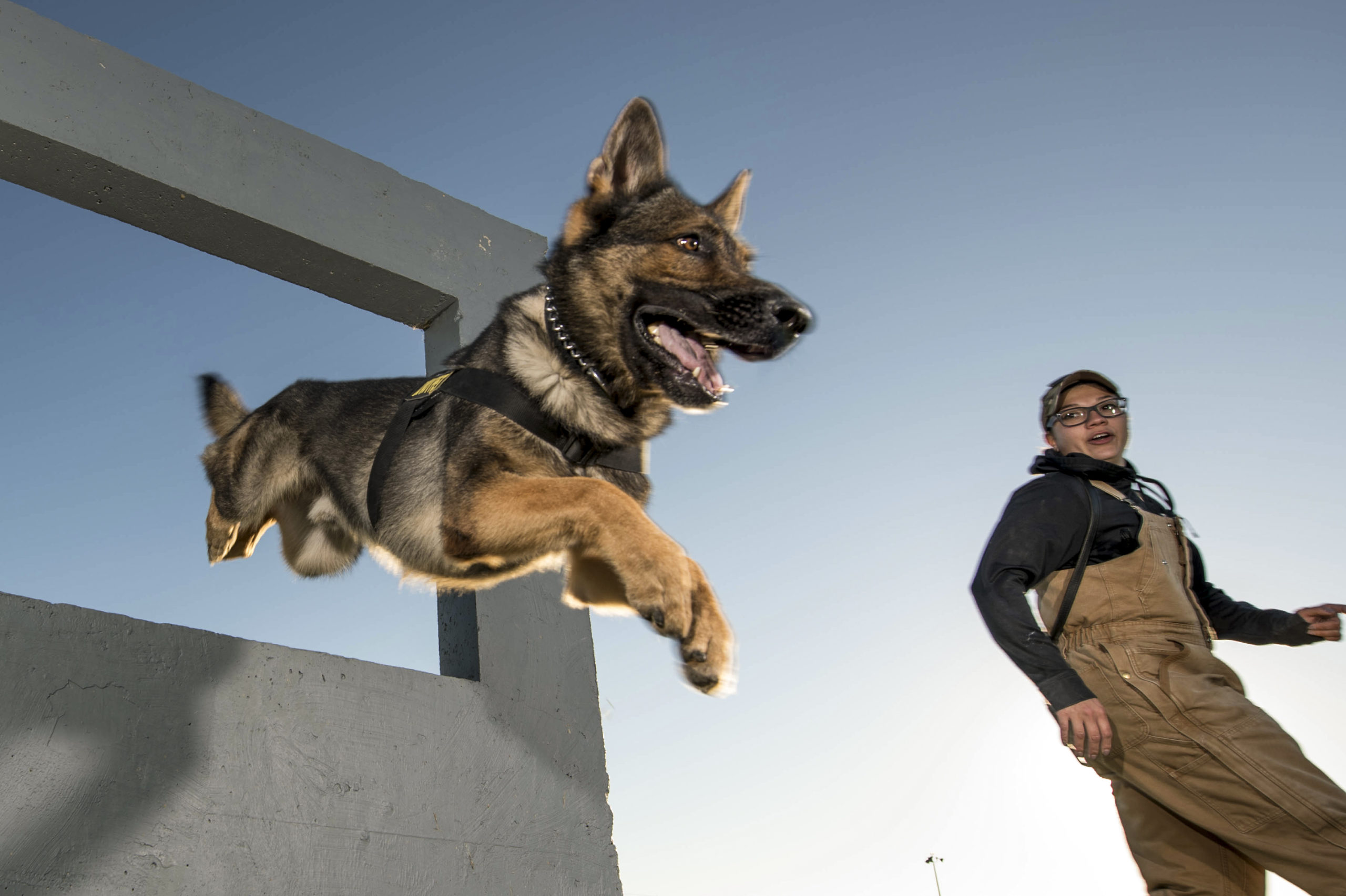 Air Force Senior Airman Theresa Braak and military working dog Sam negotiate a window obstacle in the obedience yard at Dover Air Force Base.