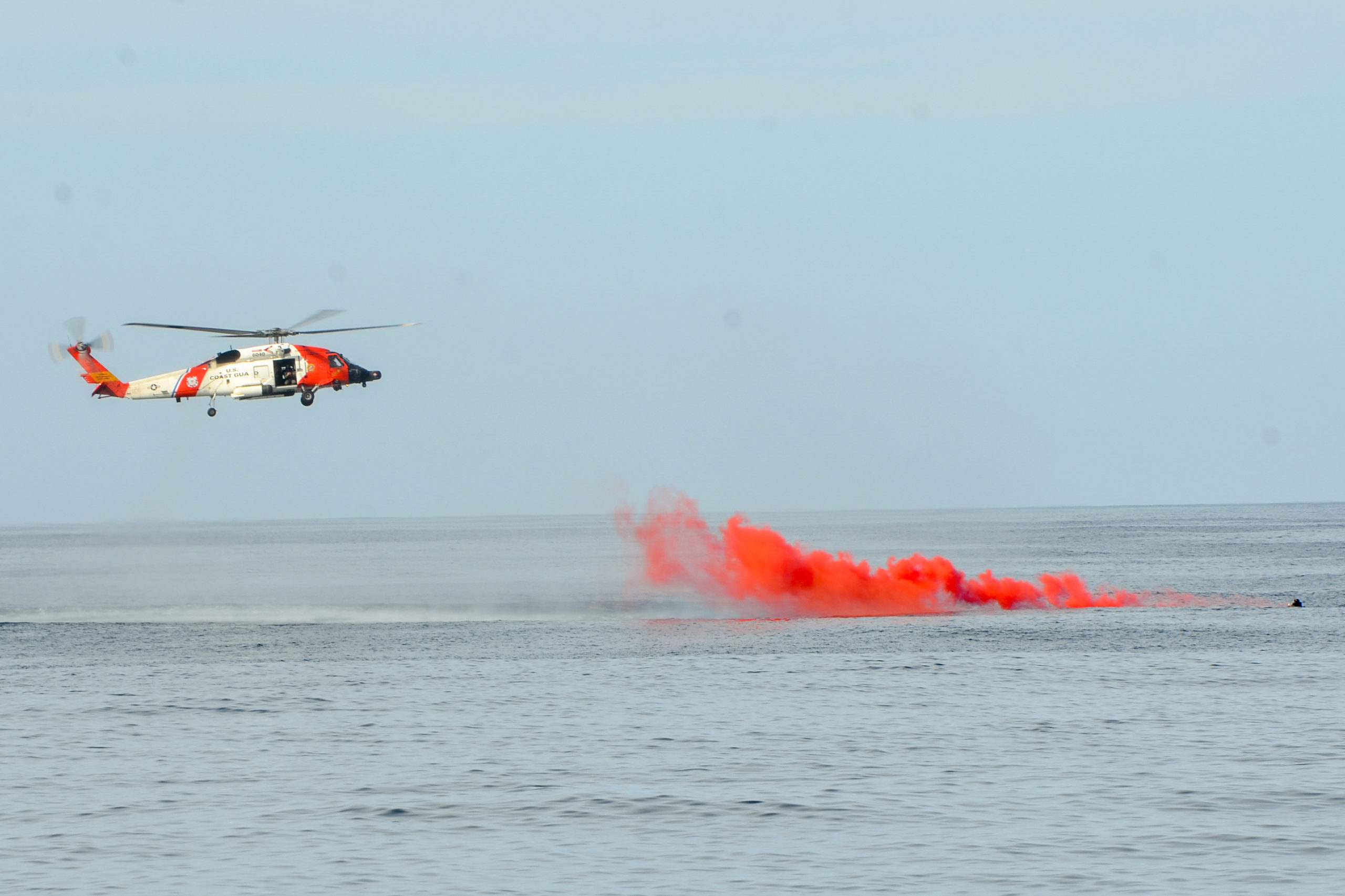 A Coast Guard MH-60T Jayhawk flies near an MK-124 smoke and illumination signal during a joint search and rescue exercise.