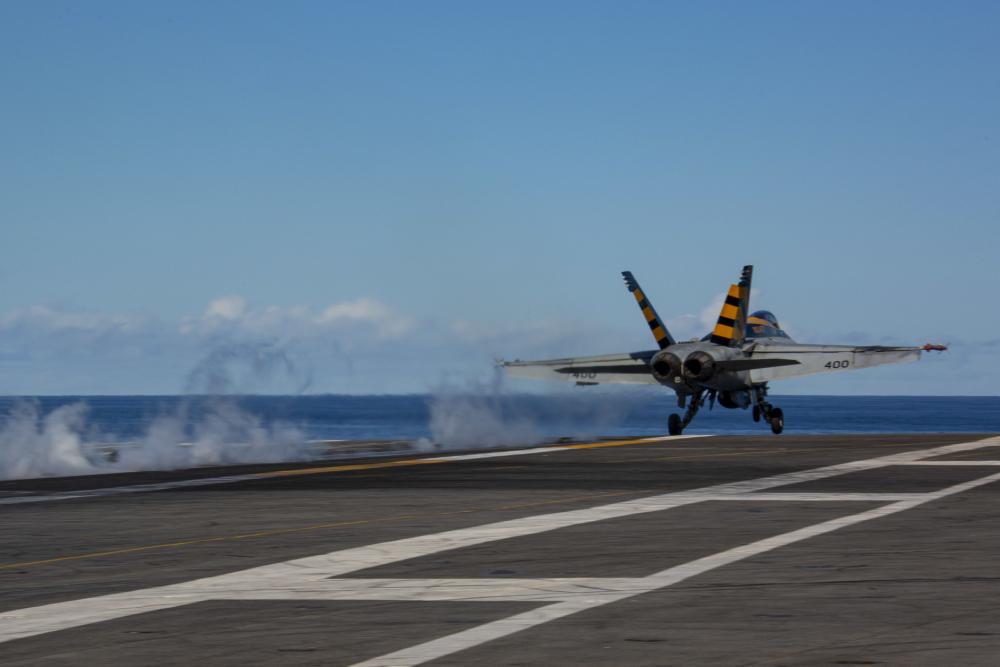An F/A-18E Super Hornet, assigned to Strike Fighter Squadron (VFA) 151, launches from the flight deck of the Nimitz-class aircraft carrier USS Abraham Lincoln (CVN 72).