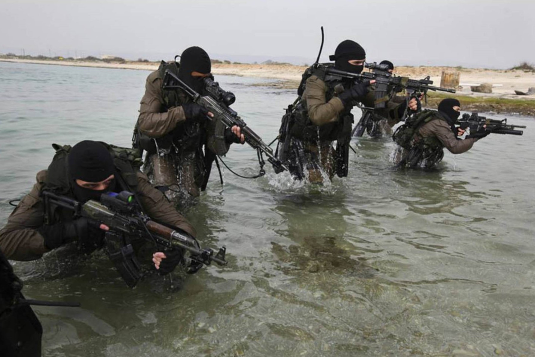 Members of Shayetet 13, part of the Israeli special operations forces, train in waist deep water.