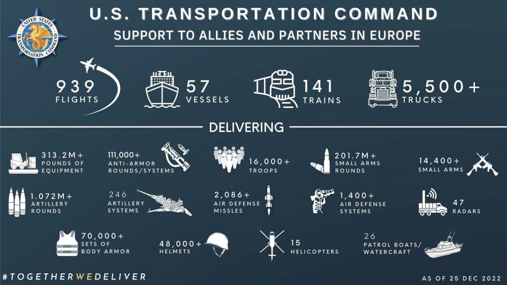 As of December 2022, U.S. Transportation Command (USTRANSCOM) has delivered more than 313 million pounds of equipment to Ukraine to help them defend themselves against Russia.